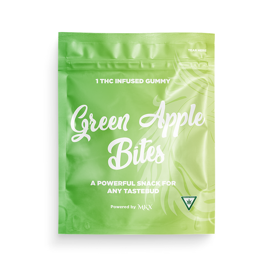 MKX Oil Co. Green Apple Bites Gummies are designed to deliver a consistent and flavorful cannabis edible experience. Each pack typically contains 200mg of THC per package, with 10 gummies per bag at approximately 20mg of THC each.
